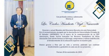 UNIVERSIDAD EVANGÉLICA DE EL SALVADOR FELICITACIÓN EN LA PRENSA GRÁFICA AL LIC. CARLOS VIGIL, MIEMBRO DE DIRECTORIO EJECUTIVO UEES Este día en La Prensa Gráfica, se extendió de manera pública la Felicitación en honor a Lic. Carlos Vigil, miembro de Directorio Ejecutivo UEES, por el reconocimiento recibido a su destacada participación como miembro [...]
