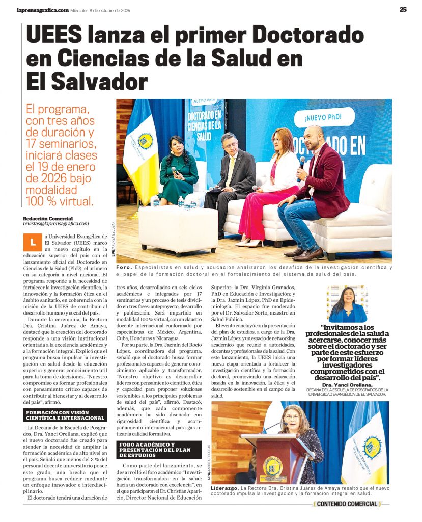 Universidad Evangélica de El Salvador NOTA DE LA PRENSA GRÁFICA: LANZAMIENTO DE DOCTORADO EN CIENCIAS DE LA SALUD