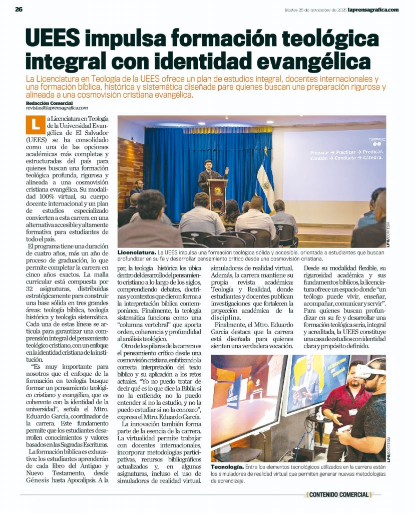 Universidad Evangélica de El Salvador NOTA DE LA PRENSA GRÁFICA: UEES IMPULSA FORMACIÒN TEOLOGICA INTEGRAL