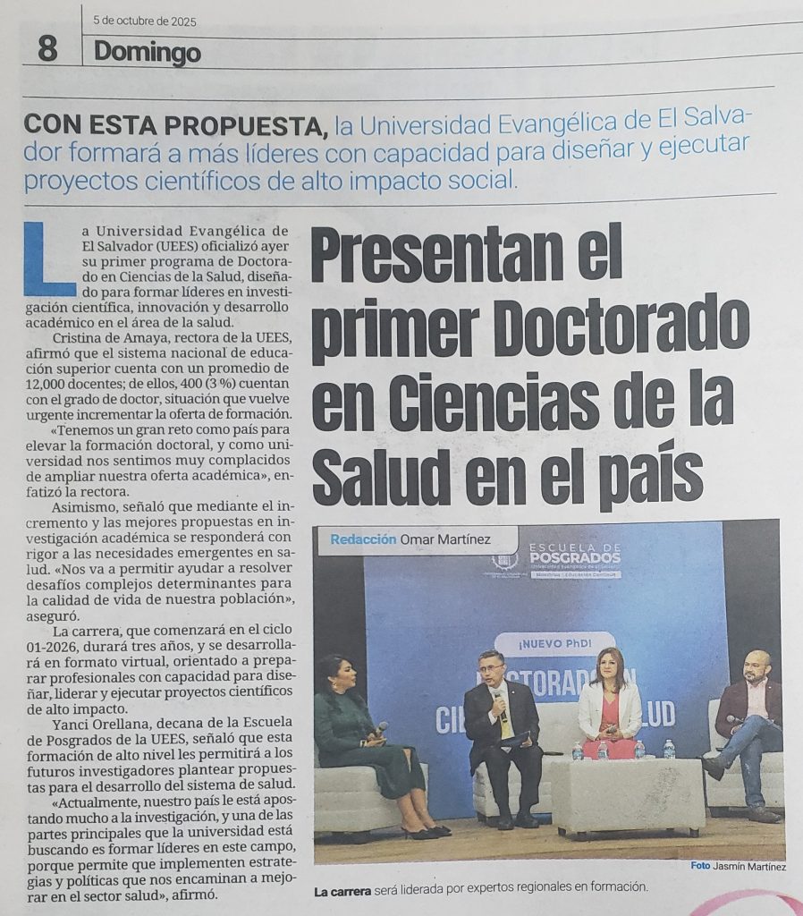 Universidad Evangélica de El Salvador NOTA DIARIO EL SALVADOR: UEES LANZA DOCTORADO EN CIENCIAS DE LA SALUD