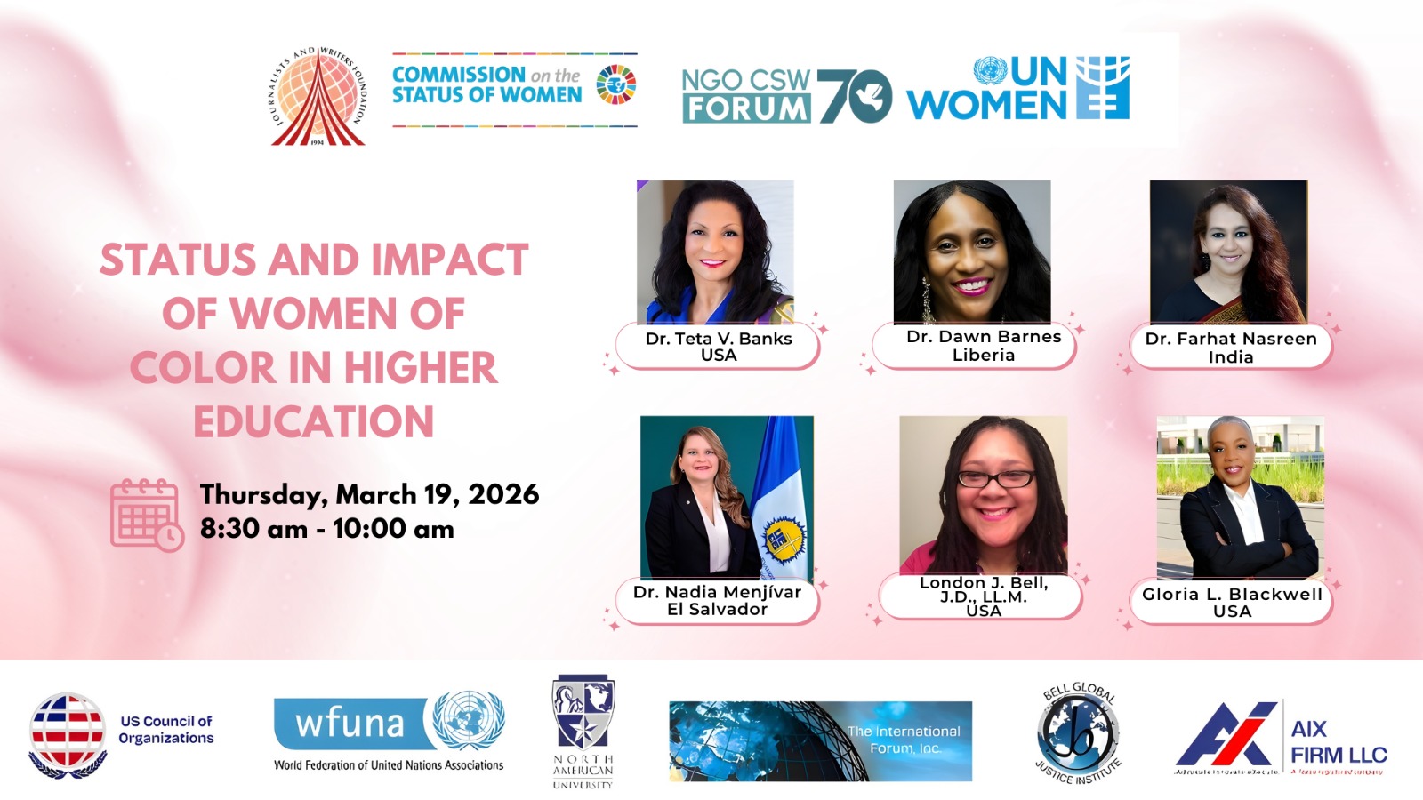 La UEES invita a nuestra comunidad universitaria a participar en la sesión virtual “Status and Impact of Women of Color in Higher Education”, desarrollada en el marco del NGO CSW Forum 70 de ONU Mujeres.