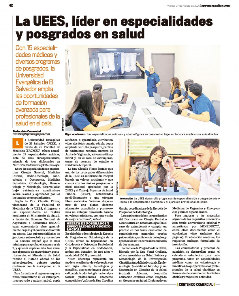 Universidad Evangélica de El Salvador NOTA EN LA PRENSA GRAFICA: UEES LÍDER EN ESPECIALIDADES Y POSGRADOS EN SALUD