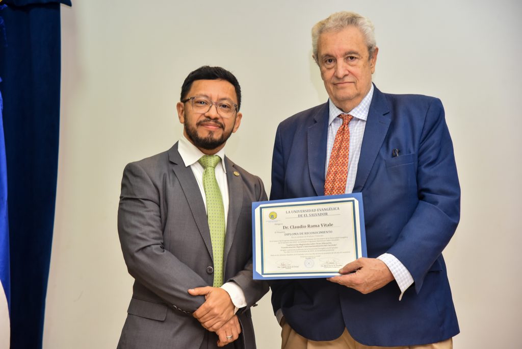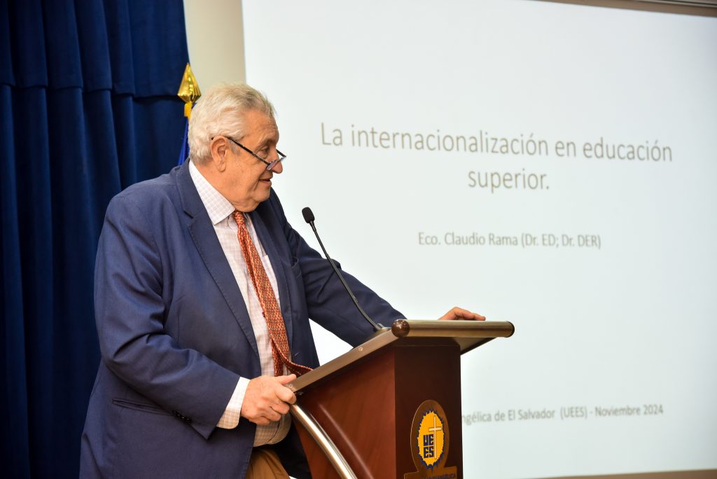 La Universidad Evangélica de El Salvador (UEES) recibió los días 12 y 13 de noviembre al reconocido especialista internacional en educación superior, Dr. Claudio Rama, quien visitó el campus para desarrollar un ciclo de conferencias dirigidas a autoridades académicas, coordinadores y directores de carrera, docentes y personal administrativo.